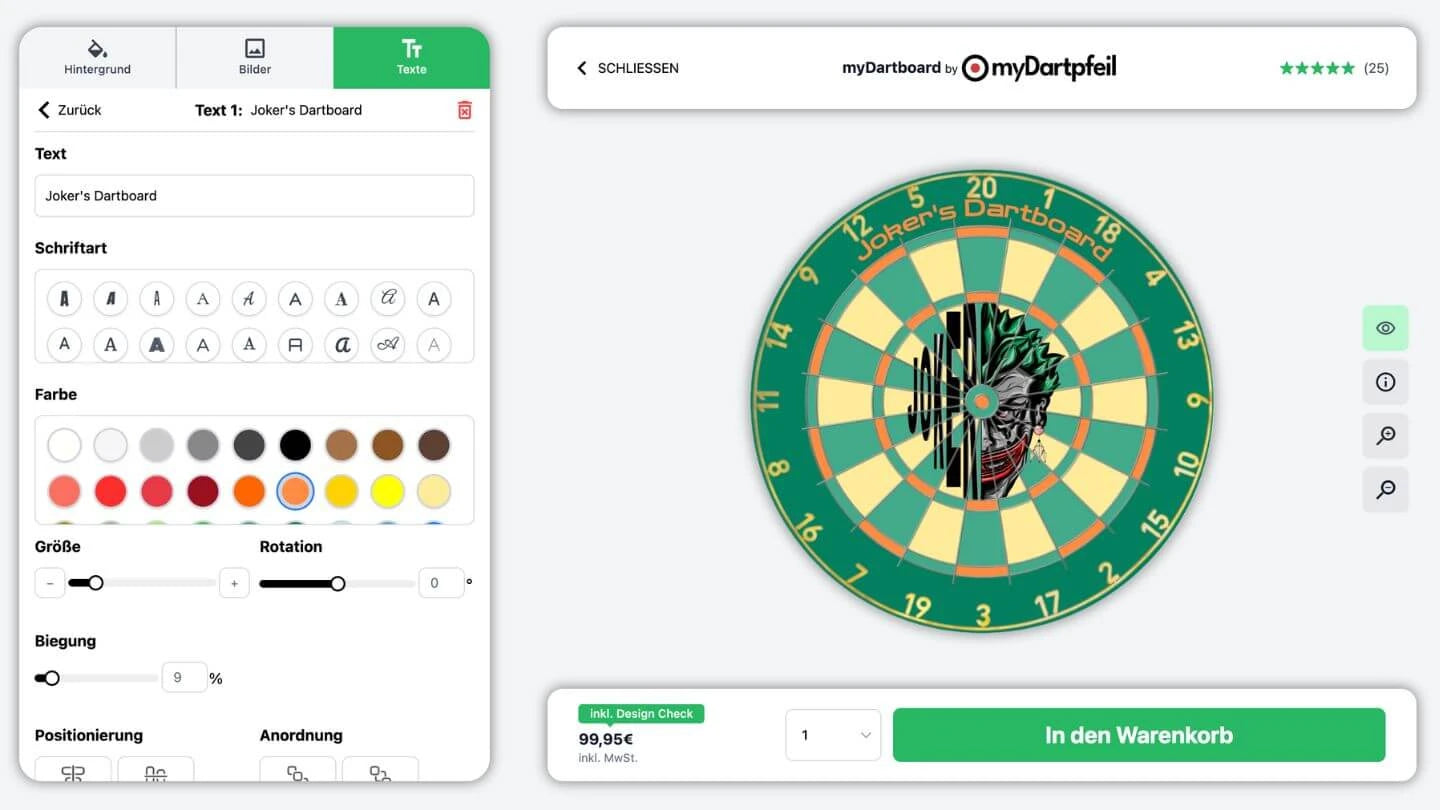 Mehr als 73.623 glückliche Kunden haben bereits bei uns eingekauftPersonalisierte Dartscheibe zum selbst gestalten mit Bild & Text